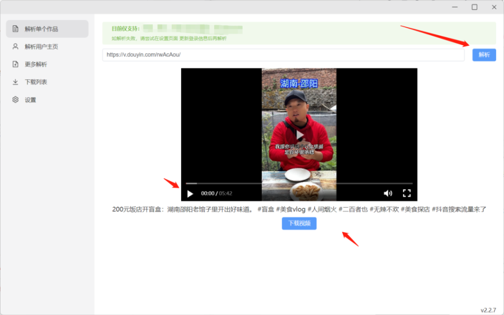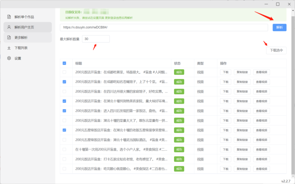 第二个功能就是可以解析用户首页,只需要输入你想解析的博主主页链接,然后再设置解析数量,点击对勾选中就可以进行视频下载。