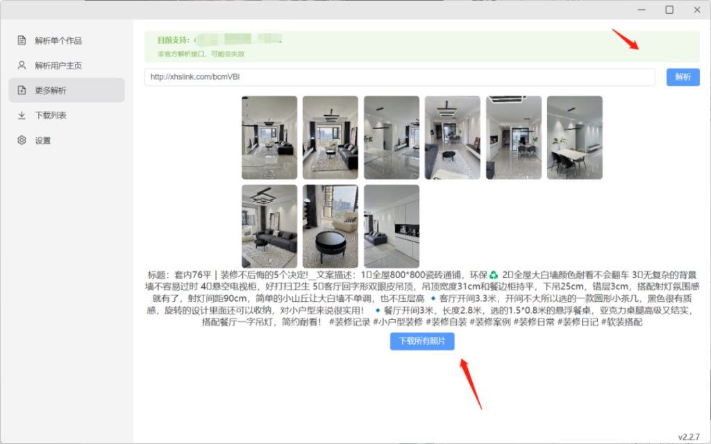第三个功能就是“更多解析”,对应的就是可以帮助我们解析某书等平台。解析功能同样也是非常棒,支持批量下载图片/视频。