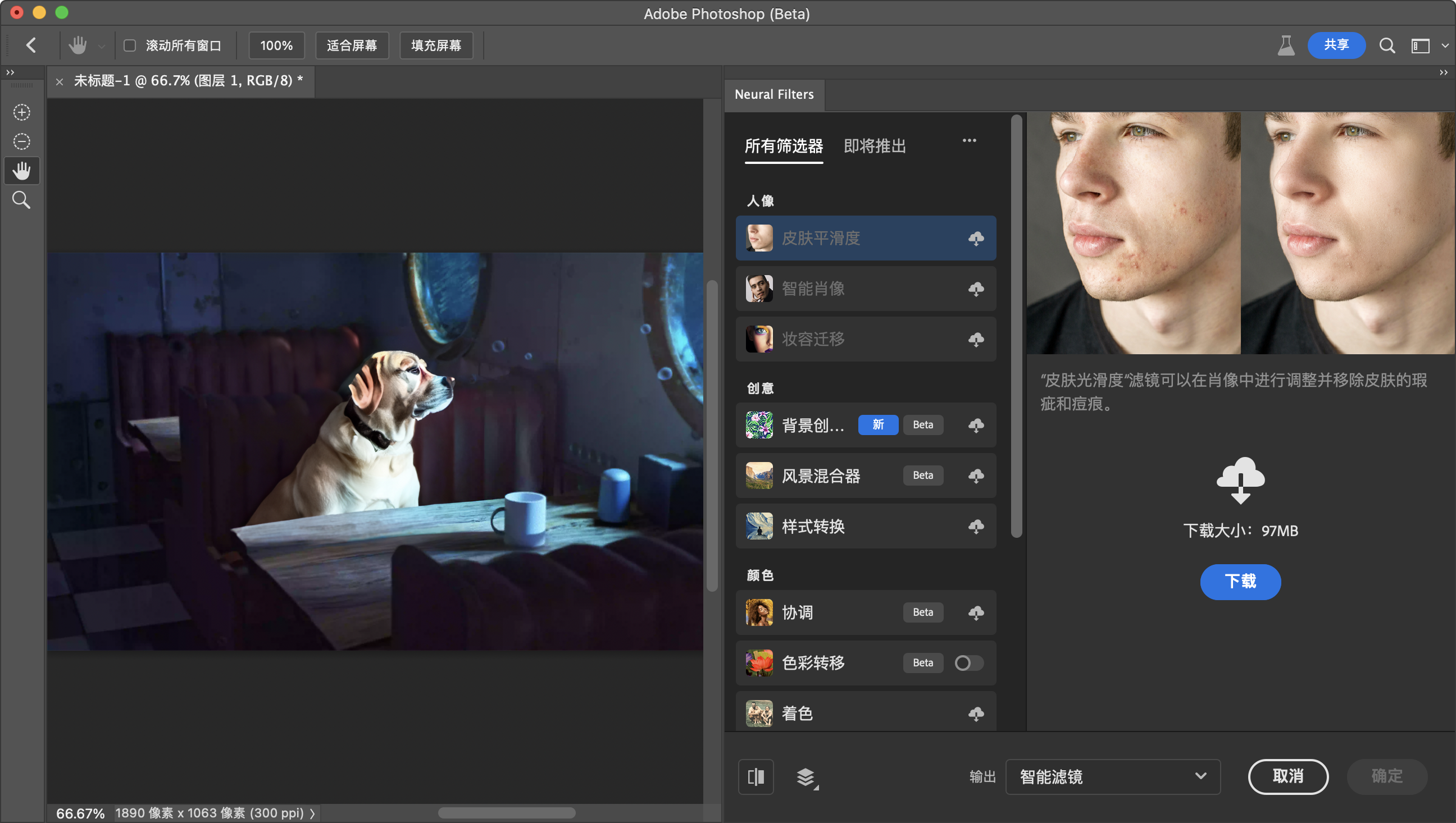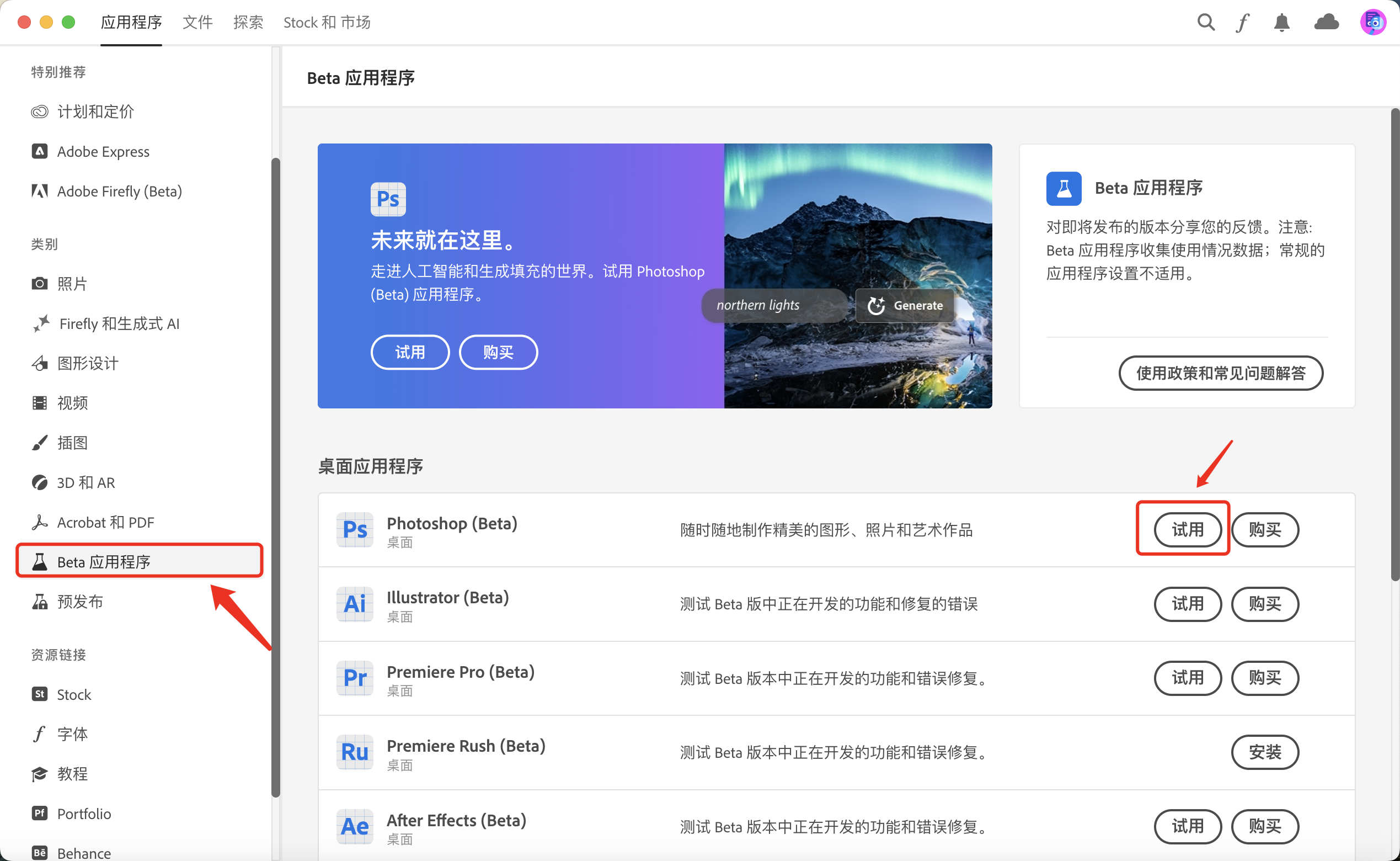 找到Beta 应用程序中的Photoshop (Beta),点击右侧的试用,等待下载完成,完成安装后打开可以直接使用,试用7天