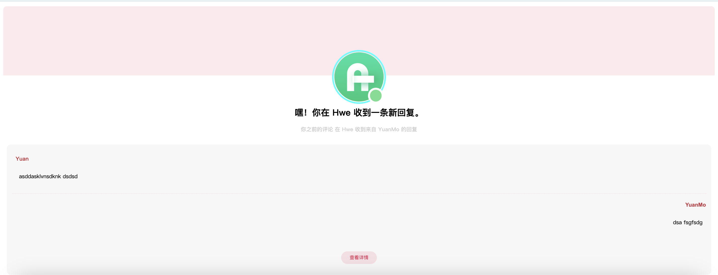 <!DOCTYPE html><html lang="zh-CN"><head><meta charset="UTF-8"><meta name="viewport" content="width=device-width, initial-scale=1.0"><title>Document</title></head><body><div><div style="display:flex;position:relative;width:100%;height:206px;background:#ef859d2e;top:0;left:0; justify-content:center; border-radius: 10px 10px 0 0;"><div style="background-image: url(https://cdn.cbd.int/imgbed-npm@2.0.6/blog/appstore.ico);position: absolute; width: 152px;height: 152px; display: flex; top:130px;background-size: cover;border-radius: 50%;border: 5px solid rgb(0, 255, 255);"></div>       <div style="border-radius: 100%; background-color: #6bdf8f; width: 35px; height: 35px; position: absolute; border: 6px solid #fff; top: 96%; left: 49.6%; transform: translate(35px,45px);"></div></div><div style="margin-top:92px;display:flex;flex-direction:column; border-radius: 0 0 10px 10px;"><div style="display:flex;flex-direction:column; margin: 0 20px;"><span style="font-size: 26px;         font-family: PingFang-SC-Bold,PingFang-SC;font-weight: bold;color: #000000;line-height: 37px;         text-align: center;">嘿!你在&nbsp;${SITE_NAME}&nbsp;收到一条新回复。</span><span class="text_2" style=" font-size: 16px;font-family: PingFang-SC-Bold, PingFang-SC;font-weight: bold; color: #00000030;         line-height: 22px; margin-top: 21px;text-align: center;">你之前的评论&nbsp;&nbsp;${SITE_NAME} 收到来自&nbsp;${NICK}&nbsp;的回复</span></div><div style="margin: 0 10px;min-height: 128px;background: #F7F7F7;border-radius: 12px;margin-top: 34px;display: flex;flex-direction: column;padding: 32px 16px;         width: calc(100% - 40px);"><div style="display:flex; margin-bottom:10px;"><span style="display:flex; flex-direction:column; margin-left:10.6px;"><span style="height:22px; font-size:16px; font-family:PingFang-SC-Bold, PingFang-SC; font-weight:bold; color:#C5343E; line-height:22px;">${PARENT_NICK}</span><span style="margin-top:6px; margin-right:22px; font-size:16px; font-family:PingFangSC-Regular,PingFang SC; font-weight:400; color:#000000; line-height:22px; padding:5px 10px;border-radius:6px;">${PARENT_COMMENT}</span></span></div><hr style="display:flex; position:relative; box-sizing:content-box; height:0px; overflow:visible; width:100%; border: 1px dashed #ef859d2e;">         <div style="display:flex; right:0; justify-content:flex-end; margin: 15px 0 20px;"><span style="display:flex; flex-direction:column;"><span style="height:22px; font-size:16px; font-weight:bold; color:#C5343E; line-height:22px; font-family:Arial,PingFang-SC-Bold,PingFang-SC; text-align:right;">${NICK}</span><span style="margin-top:6px; font-size:16px; font-family:PingFangSC-Regular,PingFang SC; font-weight:400; color:#000000; line-height:22px; padding:5px 10px; border-radius:6px;">${COMMENT}</span> </span></div><a style="min-width: 106px;height: 38px;background: #ef859d38;border-radius: 32px;         display: flex;         align-items: center;         justify-content: center;         text-decoration: none;         margin: 32px auto 0;" href="${POST_URL}">           <span style="color: #DB214B;">查看详情</span>         </a>       </div>        <div style="         display: flex;         flex-direction: column;         align-items: center;         margin-top: 34px;">         <span style="         height: 17px;         font-size: 12px;         font-family: PingFangSC-Regular, PingFang SC;         font-weight: 400;         color: #00000045;         line-height: 17px;">此邮件由评论服务自动发出,直接回复无效。</span>         <a class="text_7" style="height:17px; font-size:12px; font-family:PingFangSC-Regular,PingFang SC; font-weight:400; color:#DB214B; line-height:17px; margin-top:6px; text-decoration:none;" href="${SITE_URL}">前往博客</a>       </div>     </div>    </div>  </body>  </html>