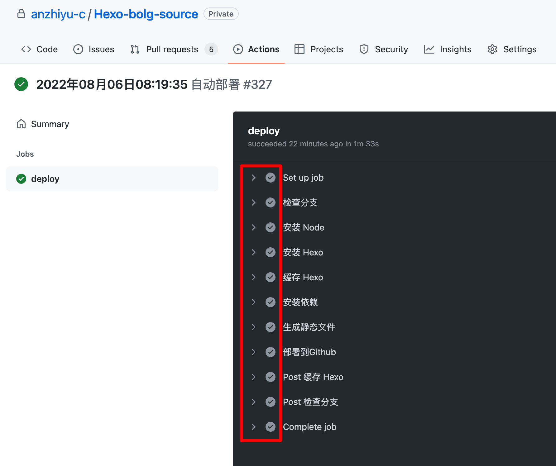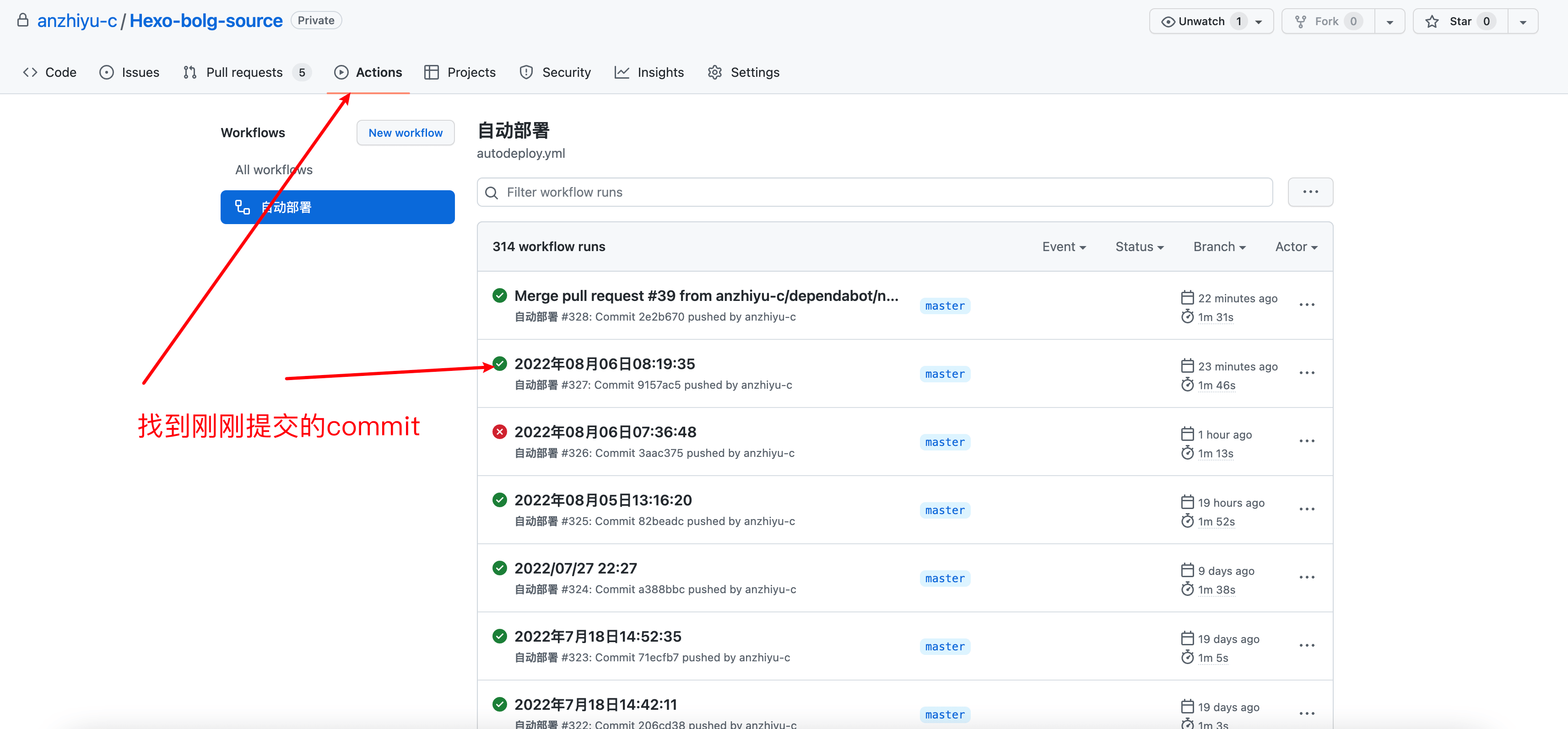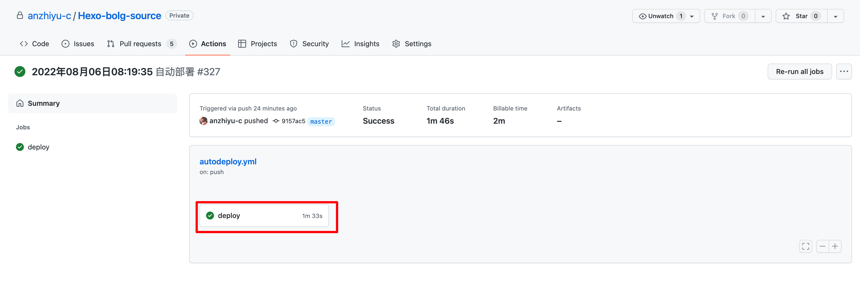 main分支有内容push进来,会自动执行 action 配置文件的命令,将 Hexo 项目编译成静态页面,然后部署到公共仓库的master分支。master分支是 GitHub Pages 服务的固定分支,你只需在autodeploy.yml文件正确填写,会自动创建。 - 在私有仓库的 Actions 可以查看到你配置的 action。