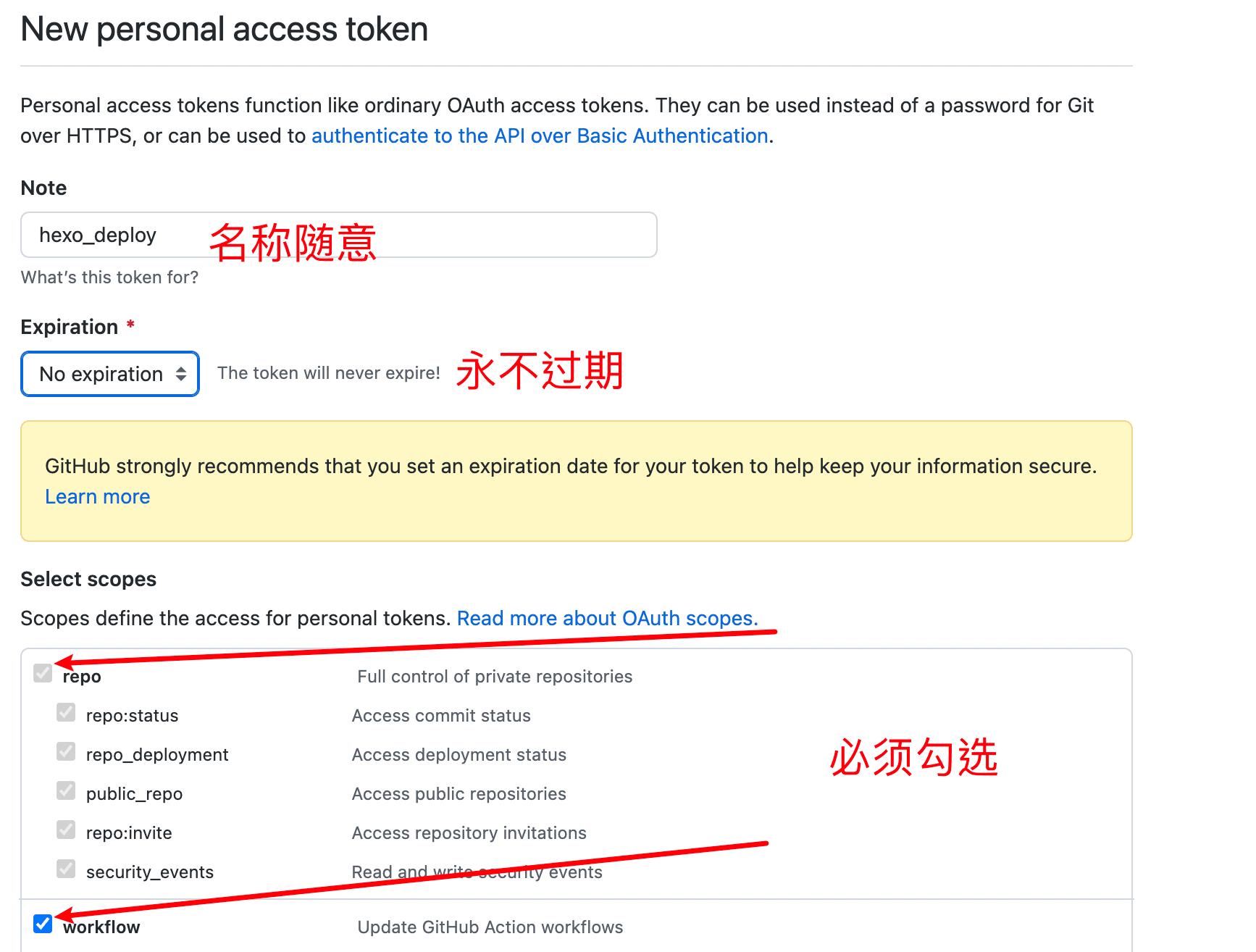 创建一个有 repo 和 workflow 权限的 GitHub Token 。