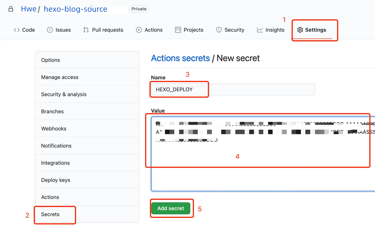 将上面生成的 Token 添加到私有仓库的 Secrets 里,并将这个新增的 secret 命名为 HEXO_DEPLOY (随意)。