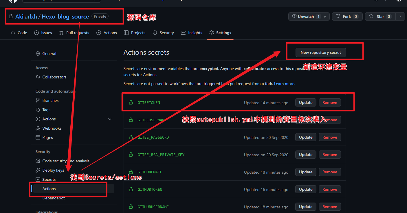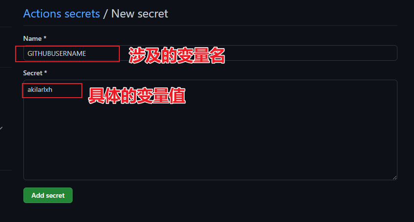 步骤:私有仓库 -> settings -> Secrets -> New repository secret。